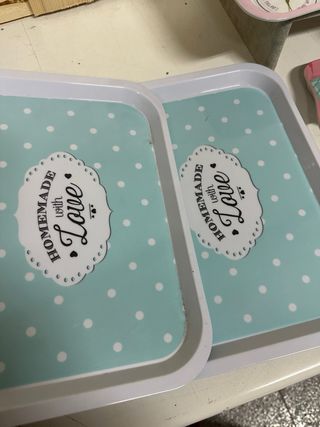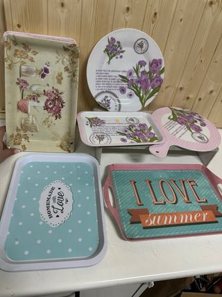Conjunto de doce bandejas con diseños variados, perfectas para añadir un toque especial a tu hogar. - Bandeja rectangular con diseño floral y estilo vintage. - Plato redondo con flores moradas y texto. - Bandeja rectangular con compartimentos y diseño floral. - Bandeja redonda con asa y diseño floral. - Bandeja rectangular con lunares y texto Homemade with Love. - Bandeja rectangular con texto I LOVE summer y diseño a rayas. La más grande mide 33-24 cm aprox