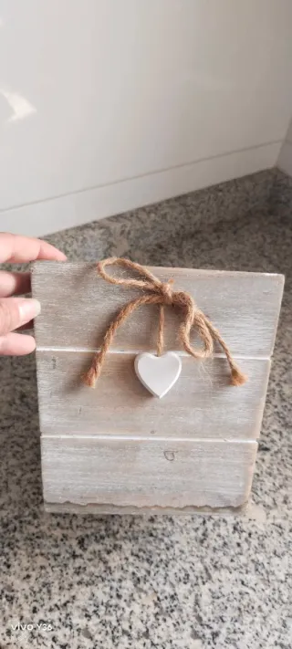 Bonita caja decorativa de madera con un diseño rústico y un detalle de corazón.