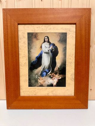 Cuadro religioso con una escena celestial y ángeles, enmarcado en madera. - Imagen impresa sobre papel. - Marco de madera.