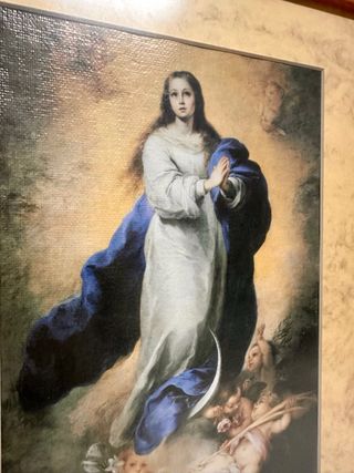 Este es un antiguo cuadro religioso con una niña rezando. El marco es de estilo barroco y está decorado con motivos florales. - Marco dorado con detalles ornamentales. - Imagen de una niña con las manos juntas en oración. - Pequeña figura religiosa en la parte superior izquierda. No pintado Mide 47-33 cm aproximadamente