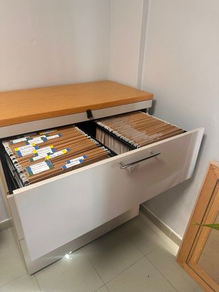 Archivador de seguridad con un diseño moderno y funcional. - Acabado superior en madera. - Cajones con tiradores metálicos. - Cerradura de seguridad.