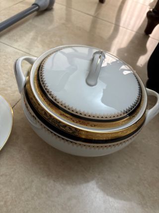 Elegante sopera de porcelana con un diseño clásico y refinado. - Acabado principal en blanco. - Bandas decorativas en dorado y negro. - Asa en la tapa para facilitar su manejo.