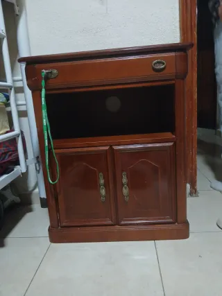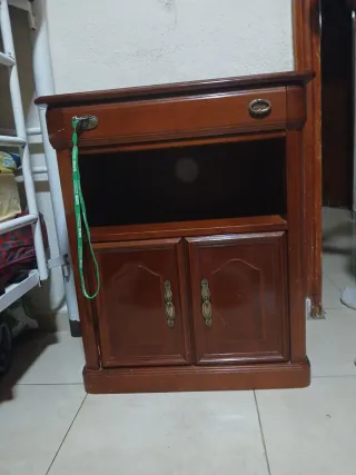 Mueble de madera con un diseño clásico y elegante. - Un cajón superior con tirador metálico. - Dos puertas inferiores con tiradores a juego. - Compartimento abierto en la parte superior.