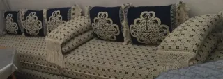 Conjunto de salón de estilo árabe con cojines. - Tapicería con estampado geométrico. - Cojines decorativos en azul marino con motivos florales. - Cojines alargados con flecos. 8 taburetes, 10 almohadas, colchones y 6 maderas distintos tamaños