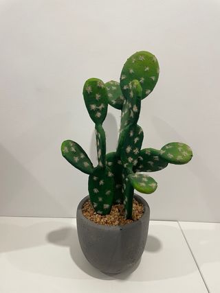 Maceta decorativa figura de cactus. Ideal para darle un toque rústico a tu hogar, terraza, jardín.. - Acabado artesanal. - Base de piedra rústica de color gris - Medida. Alto: 35 cm Se puede meter en un macetero de color para decorarlo al gusto de cada uno. La base no està rota es así..de piedra Costò: 32€ Nueva en perfecto estado