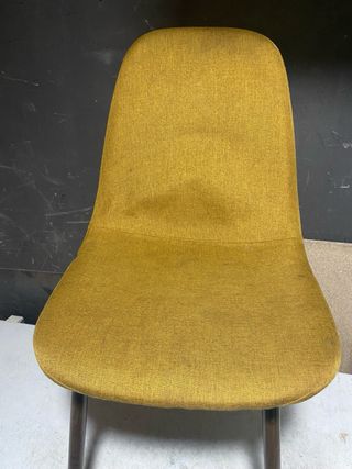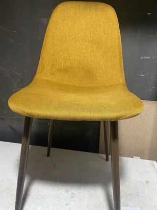 Silla de comedor con un diseño moderno y cómodo. - Tapizado en tela de color amarillo. - Patas de madera oscura.