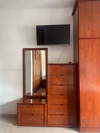 Conjunto de muebles de dormitorio de madera. - Cómoda con varios cajones. - Tocador con espejo. - Armario. - Dos mesitas de noche. - cabecero + canapé + colchón.