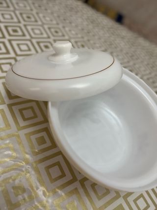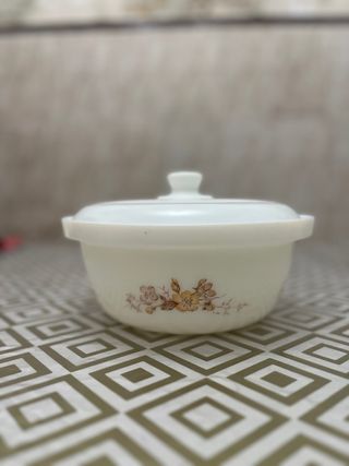 Este tazón de vidrio blanco viene con su tapa a juego. Tiene un delicado borde dorado. - Material: Vidrio y plástico. - Color: Blanco y dorado.