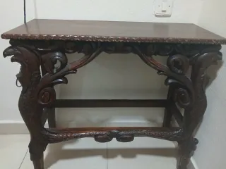 Elegante mesa auxiliar de madera con un diseño intrincado y detalles tallados a mano. - Patas con forma de garra. - Adornos ornamentales en el borde superior. - Estructura robusta con travesaño inferior.