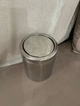 Papelera de mesa con un diseño moderno y elegante, fabricada en acero inoxidable. - Material: Acero inoxidable. - Acabado: Metálico. - Diseño: Cilindríco con tapa abatible.