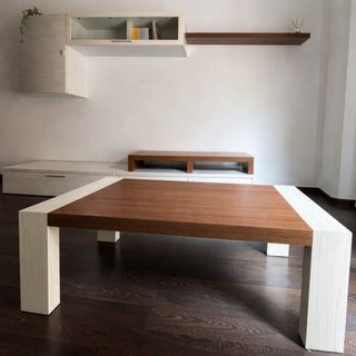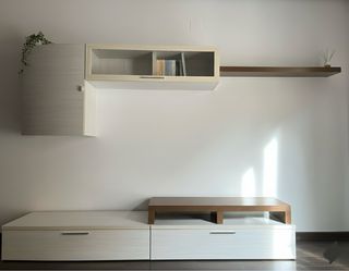 Se vende mueble de TV a estrenar de la marca Guardia. El mueble es para colgar en la pared. Se compro para piso nuevo y durante los 3 meses de fabricación se ha cambiado la idea inicial de distribución del salon y por eso se vende. Esta en la tienda para mandar directamente al comprador. El color del mueble es blanco perla la estructura y la puerta abatible y los dos cajones son madera castaño. El mueble consta de 2 módulos de 150cm, se pueden poner unidos, sobrepuesto,... como se quiera. Las imágenes son como es el mueble pero otros colores. La puerta abatible es texturizada. Precio de compra 1.850€ se vende por 1.500€