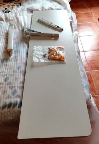 Mesa abatible de pared en color blanco, ideal para optimizar espacios. Inclye las piezas de soporte y tornillos / tacos para la instalación. Es de color blanco. En una esquina interior —poco visible—, el remate está ligeramente separado del tablero (*ver foto). No se ha instalado nunca. Mecanismo de cierre en las piezas de soporte. Entrega en Guadalix de la Sierra, Colmenar Viejo, Tres Cantos... (*Consultar), - Medidas: 100 cm de largo x 30 cm de profundidad. - Incluye soportes y tornillería para montaje.