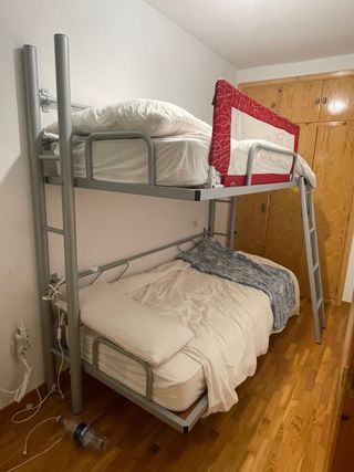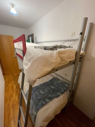 Litera abatible con estructura metálica y de estilo madera al plegarla contra la pared. Ideal para optimizar el espacio. Camas de 90x200cm. Recogida en Panticosa, Huesca a partir de final de mes de enero por reforma del apartamento. Se vende sin colchones, pero son tamaño estándar 90cmx2m