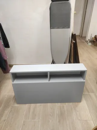 Conjunto de mueble para televisión y módulo de pared. La parte de arriba que es imitación madera, es vinilo pero puede quitarse y queda en colo beige y los cajones también forrados quedarían en blanco. La mesa de tele lleva patas que apenas se ven en la foto. Puede venderse por separado. Mesa televisión...70€ Mueble alto.........50€ - Mueble de televisión con cajones y compartimentos. - Módulo de pared superior con puerta abatible. Se pueden enviar más fotos si se desea. Medidas de la mesa de tele en el anuncio
