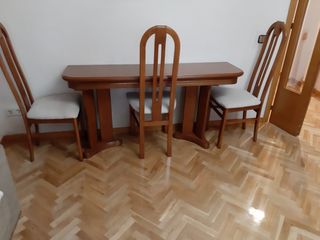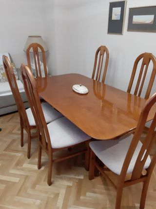 Mesa de libro de madera maciza, abatible con 6 sillas a juego recien tapizadas, todo ello en color cerezo. En perfecto estado.Medida cerrada: 160×45cm, abierta 160x90cm