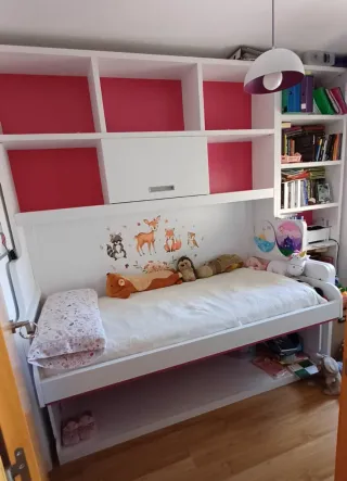 Se vende habitación juvenil completa. De aquí a finales de febrero. Urge. - Cama abatible con mesa. Para colchón de 190 por 90 (sin incluir colchón) - Mesa de 192 x 60 cm - Estanterías superiores con detalles en rosa. - Estantería de 240 x 76 x 33 cm El que la quiera la tiene que desmontar y llevársela - Regalamos lámpara a juego.