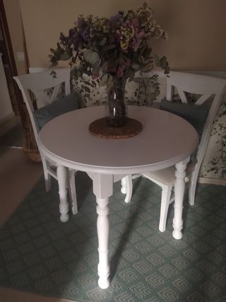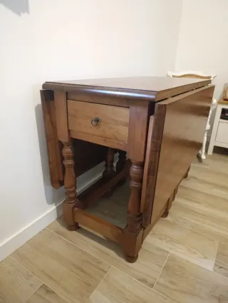 Mesa de madera maciza con un diseño clásico y funcional. Perfecta para espacios reducidos o como superficie adicional. - Acabado en tono madera. - 2 Cajones integrados con tirador. - Patas torneadas con detalles. - Laterales abatibles para optimizar espacio. - Juego de 4 sillas a juego (precio aparte)