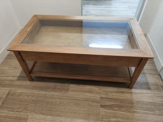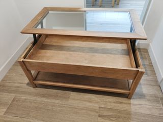Mesa de centro hecha de madera con superficie abatible de madera y cristal con bandeja inferior de madera.
