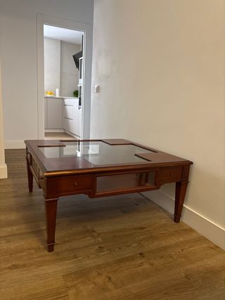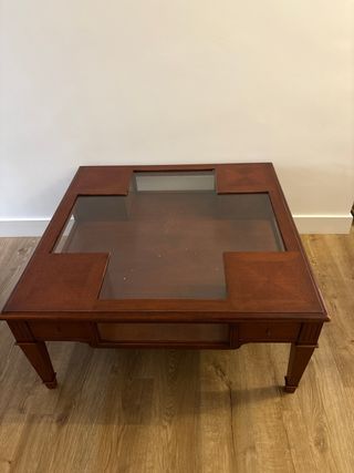 Elegante mesa de centro con estructura de madera de cerezo y tapa de cristal. - Diseño clásico y atemporal. - tapa abatible, con espacio para guardar en su interior, 4 cajones pequeños. - Ideal para dar un toque de distinción a tu salón.