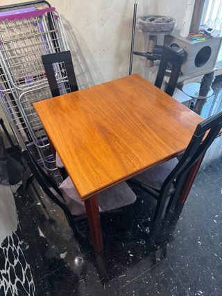Mesa de comedor con un diseño sencillo y elegante. - Tablero espacioso. - Patas robustas. Mesa cerrada 90*90 Tiene dos alas abatibles de 39cm cada una Un pequeño roze como muestra la penúltima foto