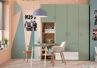 Habitación juvenil compuesta por cama abatible horizontal de 90x190 y 152 cm de altura junto a composición de escritorio con cajonera de cuatro cajones bicolor y bajo de mesa de escritorio, estantería de colgar diáfana cerrada y módulo de colgar con puerta con pulsador y hueco. Altura máxima del colchón de 15 cm. *Disponemos de camas abatibles de 105x190, 90x200 y 105x200. Disponemos de una gran variedad de colores para los acabados y de tiradores. Transporte y montaje de la composición 120€.