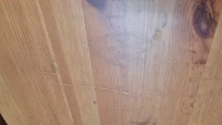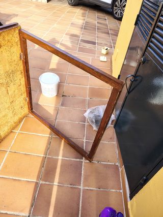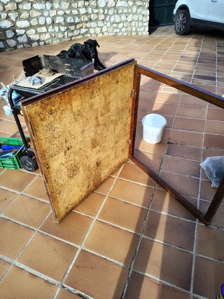 Mesa de 84x84 forrada de corcho por la parte que se pliega, quedando como si fuera un cuadro y por la otra parte es formica,ya que servía como mesa supletoria para comer.Es abatible y las patas cuando está plegada le sirven de decoración, resultando un marco en la misma superficie del corcho. Ha sido un diseño propio, pero muy práctico. La parte superior va sujeta al marco principal con bisagras.
