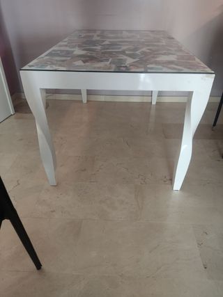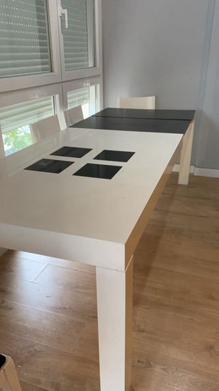 preciosa mesa de comedor color blanco como nueva, de madera como la buena de antes que ya no hacen, mide 1.50cm y se puede abrir hasta los 2.20cm de largo, 90cm de ancho y 75 cm de alto, sólo abierta 1 vez, lleva cristal incluido, perfecta para meterle fotos debajo para que quede un mosaico familiar. Costó 600 euros.