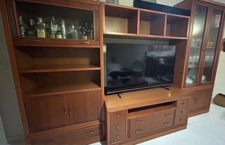 Mueble de salón compuesto de 4 piezas. Madera de muy buena calidad. Tiene algún arañazo sobre todo en el tablero donde está el televisor. Por lo demas está perfecto. El mueble del televisor mide 60 de fondo y 137 de largo y los otros dos mide 40 de fondo y 90 de largo. Total 3,17 metros. Disponible tambien un aparador y mesa extensible con 6 sillas. Aparador 400 euros Mesa y 6 sillas 700 euros Salón completo más mesa de centro abatible de regalo 1500 euros