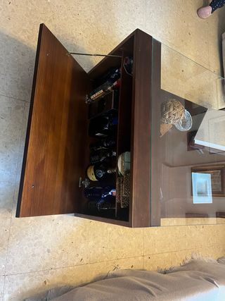 Mesa color wengué como nueva, de madera de calidad, se abre hacia arriba y tiene hueco dentro. Muy práctica y elegante para salón. Precio negociable.
