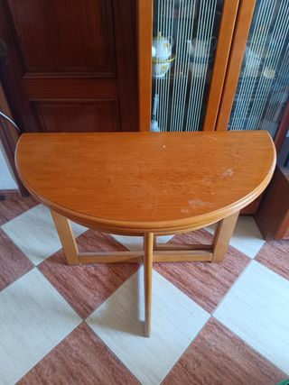 Preciosa mesa abatible de madera, ideal para espacios reducidos. Se encuentra en buen estado, aunque presenta algunas señales de uso. - Diseño de media luna. - Mecanismo abatible.