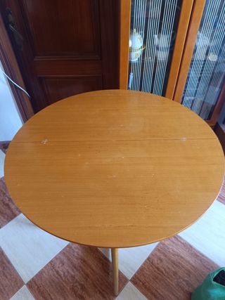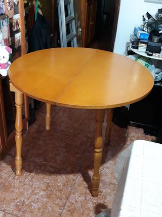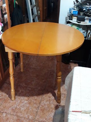 Mesa de comedor redonda con diseño abatible. Su superficie permite expandir el espacio según sea necesario. Es fasil Abrirla y se desmonta las patas HAORA la DEJO 60€ - Patas torneadas de madera. - Acabado en tono natural.
