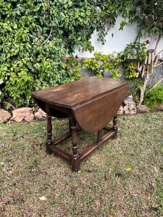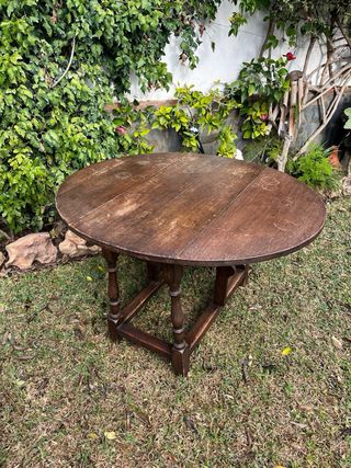 Elegante mesa de madera con diseño ovalado y alas abatibles. Perfecta para optimizar el espacio. Acabado en tono marrón oscuro. Patas torneadas con detalles. La mesa tiene algunas marcas de vasos, se ha dejado tal cual por si se le quiere echar una mano de barniz aceite o si se quiere pintar. 106 de ancho 91,5 de largo y 64 cm de alto