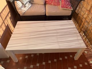 Mesa madera color blanco con vetas grises y abatible. Tiene un desperfecto en la parte interior (ver última foto) Va a juego con resto de mobiliario también a la venta