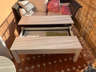 Mesa centro salon-comedor, es abatible, se puede subir. Tiene un pata rota, pero la hemos arreglado con pletina y pegada. Funciona. Por lo demàs, está en muy buen estado.