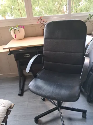 Conjunto de mesa de escritorio con ala abatible y silla. - Mesa con superficie inclinable. - Ala lateral abatible para mayor espacio. - Silla ergonómica con ruedas.