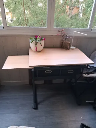Escritorio funcional con un diseño moderno. - Patas metálicas blancas. - Dos cajones para almacenamiento. - Espacio abierto adicional detrás con tapa abatible Recogida y carga por los medios del comprador esta en un almacén en Coin
