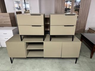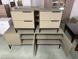 Conjunto de muebles de salón o dormitorio en color beige. - Aparador con puertas abatibles y estantes. - Dos mesitas de noche con dos cajones cada una. - Patas metálicas negras.