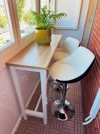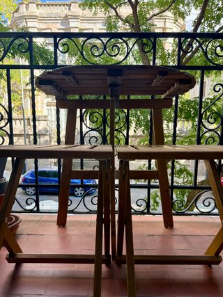 Vendo conjunto de balcón IKEA compuesto por mesa plegable y 2 sillas plegables de madera de acacia. 📍 Estado: usado, con señales normales del uso en exterior, pero en buen estado general y estable. Perfecto para balcones, terrazas o pequeños espacios, ya que se pliega fácilmente y ocupa poco espacio. 🔹 Material: Los muebles son de acacia, una madera duradera y resistente gracias a la alta densidad de sus fibras. Medidas mesa: 70x44 cm Medidas taburetes: 37x45 cm 🔹 Diseño práctico y minimalista, ideal para desayunos, cafés o cenas al aire libre. - Diseño compacto y funcional. - Fácil de guardar y transportar.