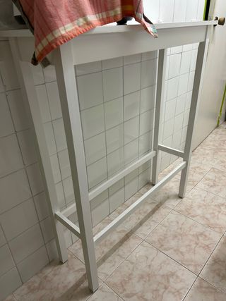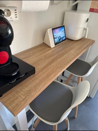 Mesa auxiliar con un diseño moderno y funcional. Ideal para cualquier rincón de tu hogar, especialmente en la cocina. - Tablero con acabado imitación madera. - Patas de metal negro. - soporta hasta 100 kilos - patas ajustables válidas para suelos irregulares La vendo desmontada Usado solo 1 semana debido a mudanza.