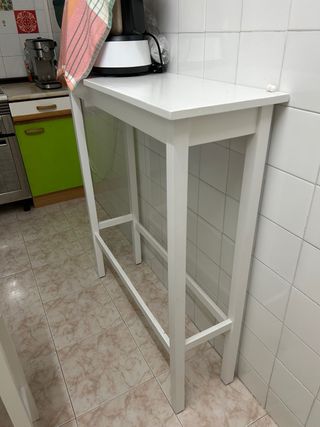 Mesa alta y estrecha, ideal para cocinas o espacios reducidos. Medidas: Largo: 90cm Ancho: 30cm Alto: 110cm