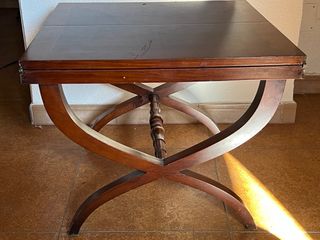 Elegante mesa de comedor con un diseño clásico y funcional extensible. Perfecta para dar un toque cálido a tu hogar. - Acabado en madera de alta calidad. - Color marrón oscuro. - Base robusta y estable. Mide abierta mide 111 cm lado a lado x 83cm ancha y de alto 79cm y cerrada mide 83cm x 83 cm Recogida en Orcasitas.