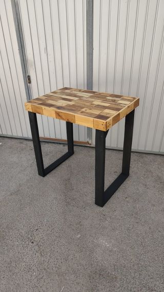 Elegante mesita alta con un diseño moderno. - Patas robustas para mayor estabilidad. - Superficie cuadrada. Se puede barnizar con dejar así con el desgaste típico de la madera, es de madera natural