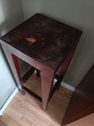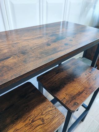 Conjunto de mesa alta y dos taburetes fabricados en madera maciza. Ideal para espacios reducidos o como solución auxiliar. - Mesa alta de madera maciza. - Incluye dos taburetes a juego. - Diseño rústico y funcional. - Apoya pies protegidos con metal Tienen algo de desgaste por uso en la parte superficial pero se puede pulir y quedaría como nuevo