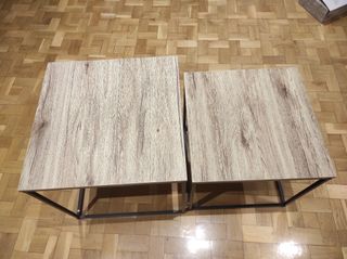 Conjunto de dos mesas auxiliares con un diseño moderno y versátil. - Tableros con acabado imitación madera. - Estructura robusta de metal negro. La mesa más alta mide 50x50x50 y la pequeña 45x45x45. Precio por las dos juntas.