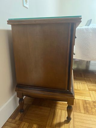 Elegante mesita de noche con un diseño clásico y funcional. Perfecta para añadir un toque de estilo a tu dormitorio. - Acabado en madera de alta calidad. - Tapa superior de cristal. - Tres cajones con tiradores decorativos.
