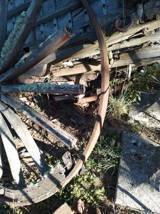 Lo que queda de carro antiguo , de madera . aro de hierro para hacer mesa ?