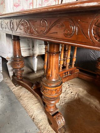 Elegante mesa de comedor antigua con un diseño clásico y robusto. Perfecta para dar un toque de distinción a tu hogar. - Elaborada en madera de alta calidad. - Acabado en un cálido tono marrón.medidas largo 1,60 × 90 es extensible recogerlo en ciudad rodrigo