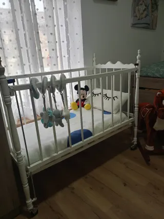 Cuna de bebé muy antigua, pero conservada. Pintada en color blanco, con un diseño clásico y elegante. - Estructura de madera. - Barreras de seguridad. - Ruedas para facilitar el movimiento. Es la cuna que hemos usado mis hermanos y yo, que decidí rescatarla para colocarla en una segunda vivienda. Tiene algún desperfecto en la pintura y algún barrote se mueve, pero la verdad, nos ha servido para verano y fines de semana. Me da una pena tremenda tirarla por el valor sentimental y si a alguien pudiera venirle bien me encantaría que la comprara. Colchón comprado a medida con 3 meses de uso. Medidas 115 cm x 60 cm Colchón 100cm x 50cm