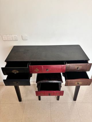 Precioso escritorio antiguo de madera, ideal para darle un toque clásico a tu hogar u oficina. Se encuentra en buen estado de conservación. - Estilo clásico y elegante. - Posee un cajón superior y compartimentos en la zona de escritura. Tabla extraible para escritura. - Madera oscura con detalles
