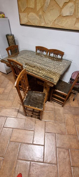 mesa trillo con cristal de 1,2 cm de grosor laminado laminado y 6 sillas antiguas